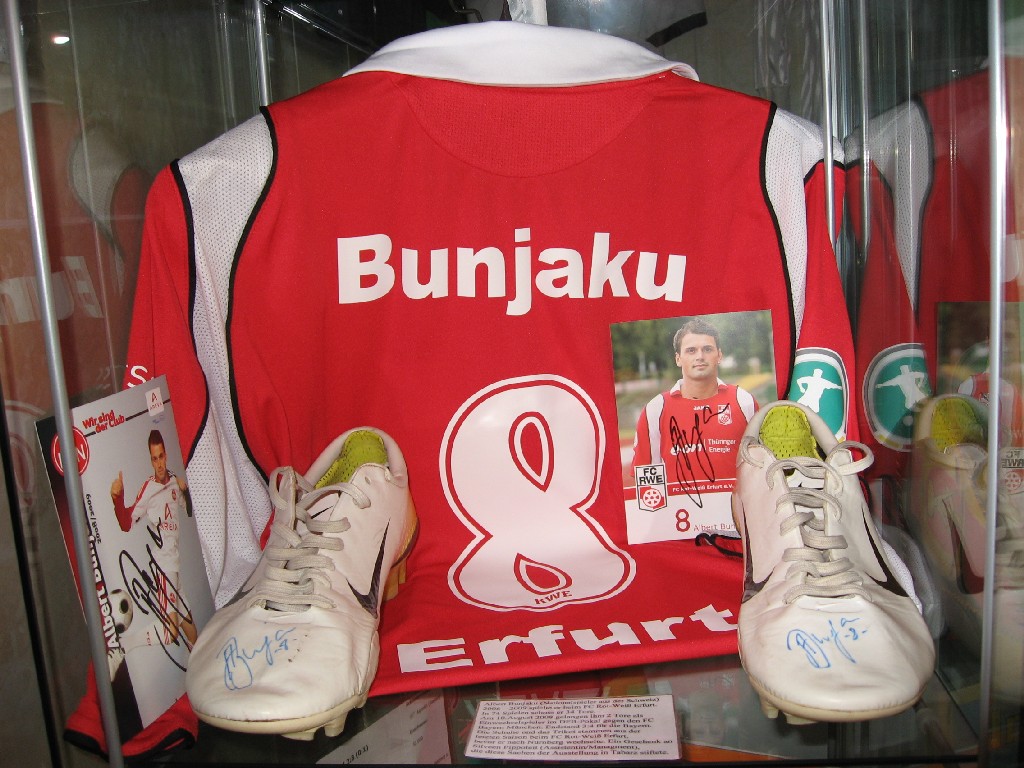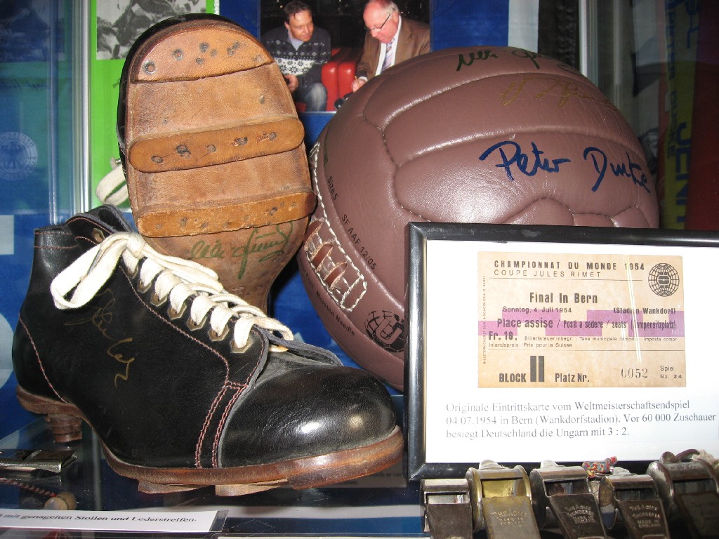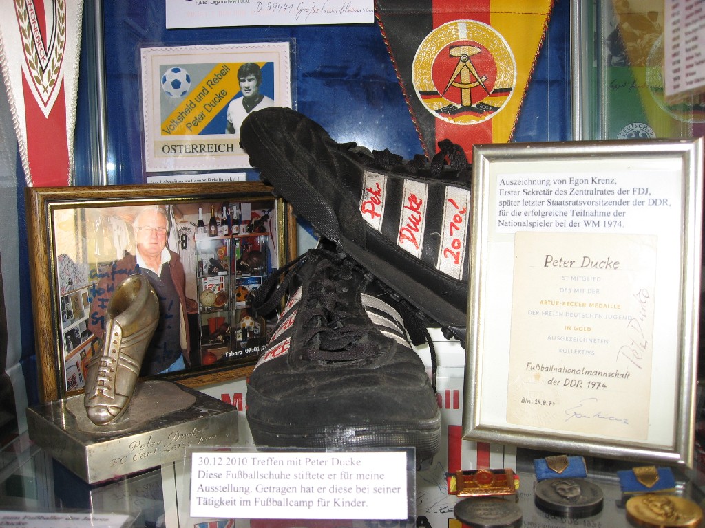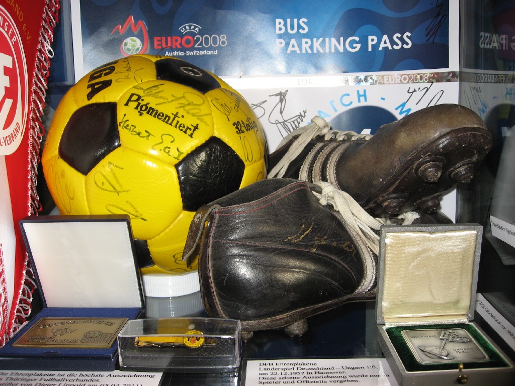 Was eine Ausstellung interessant macht, sind nicht unbedingt die Bilder an den Wänden. Es sind mehr die persönlichen Gegenstände, ehemaliger Fußballhelden. Oder orginale, geschichtsträchtige Kostbarkeiten. Ich verspreche Ihnen, davon einiges zu bieten. Peter Ducke, DDR Fußball-Legende, präsentiert zum Beispiel seine größten Auszeichnungen. Werner Treimetten, Manager von Uwe Seeler, hat aus seinem Fundus der "Uwe Seeler-Traditionsmannschaft", einige tolle Stücke abgegeben, die staunen lassen. Ein original getragenes Trikot von Jürgen Grabowski, Ulf Kirsten und eine Hose von Hansi Müller sind ebenfalls zu entdecken. Renate Kehl, die Sekretärin des Ehrenspielführers und Weltmeister von 1954 Fritz Walter, hat aus dessen Nachlass viele Gegenstände der Ausstellung geschenkt. Dem Wolfgang Hochfellner, Zeugwart und Busfahrer der deutschen Nationalmannschaft, bin ich sehr dankbar, dass ich auch aktuelle Sachen ausstellen kann. Nicht zu vergessen ist auch Silveen Pippoleit, Assistentin/Managment vom FC Rot-Weiß Erfurt. Sie übergab mir die Schuhe und das Trikot vom Schweizer Nationalspieler Albert Bunjaku, aus dessen letzter Saison in Erfurt.