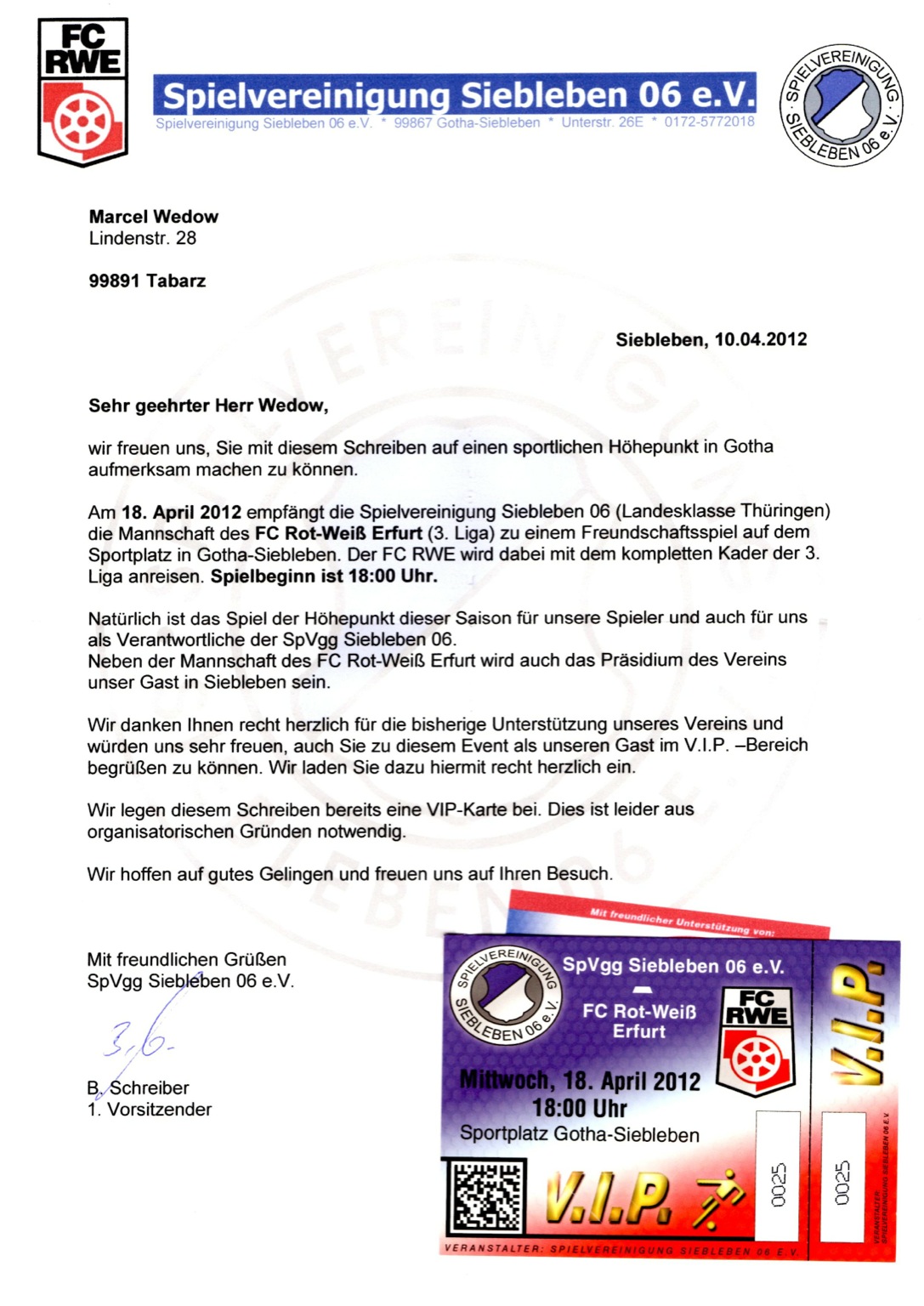 Ein Dankeschön in Form einer VIP-Karte erreichte die Fussballzeitreise. Der Kontakt soll noch vertieft werden. Wir freuen uns !
