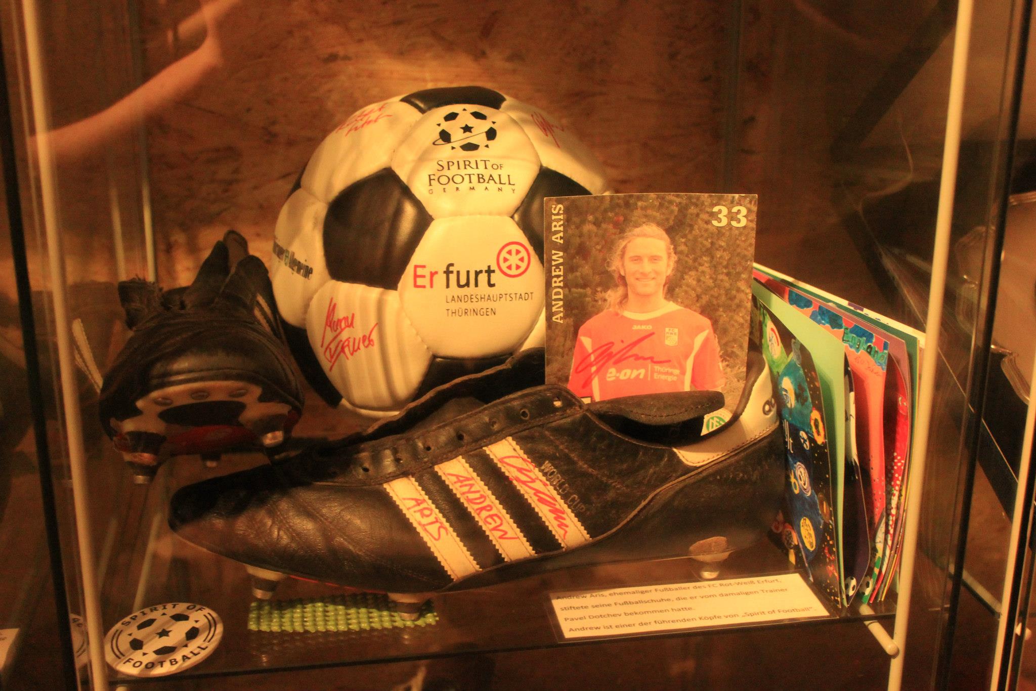 Eine Zeitreise durch die Deutsche Fussballgeschichte. Ein Vitrinenfach nur für "Spirit of Football". Einer der führenden Köpfe ist Andrew Aris, ehemaliger Spieler des FC Rot-Weiß Erfurt. Seine Geschenke an die Fussballzeitreise sind auch Symbol für eine hoffentlich lange Zusammenarbeit !