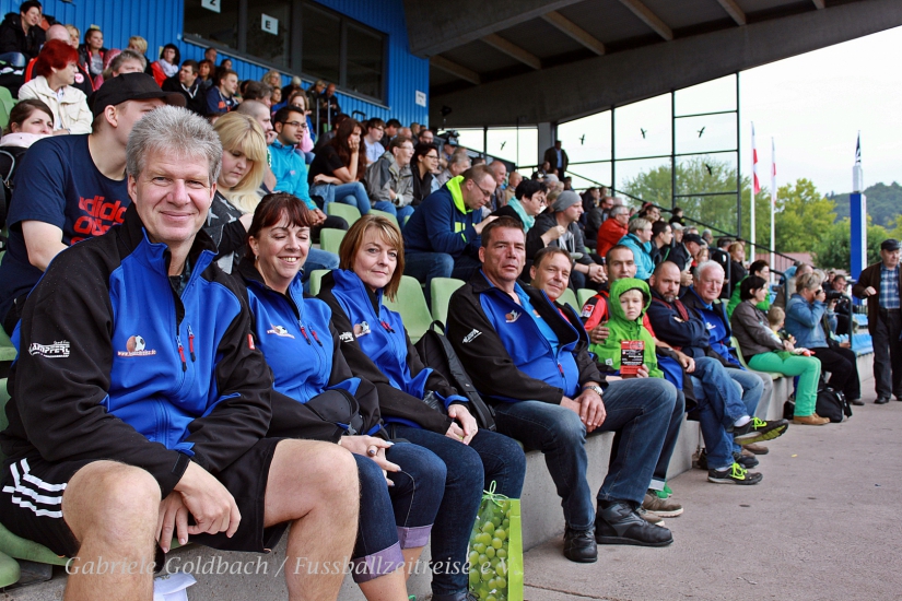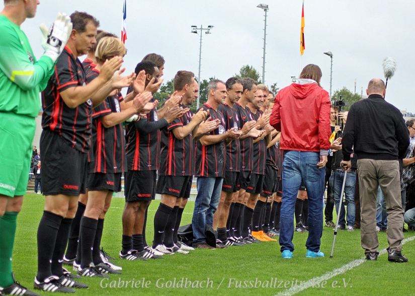 Etwas Besonderes ist auch der Auftritt von „Fußballgott“ Alex Meier (AMFG14), der zusammen mit Dietmar Roth den Ehrenanstoß zum Spiel durchführt. Emotional wird es, als Dietmar Roth im Rollstuhl an der Tribüne vorbeikommt, geschoben von seiner Frau. Die gesamte Tribüne erhebt sich respektvoll und applaudiert Dietmar minutenlang. Ein bewegender Moment. Tränen fließen bei Dietmar, Gefühle bahnen sich ihren Weg. Es ist ein Wiedersehen mit Freunden. Die Fußball Gemeinde ist letztendlich doch eine große Familie und hält zusammen. Viele Zuschauer haben den Weg ins Marburger Fußballstadion gefunden. Die Tribüne ist gut gefüllt, so dass wohl ein stattlicher Betrag als Spende zusammenkommt.