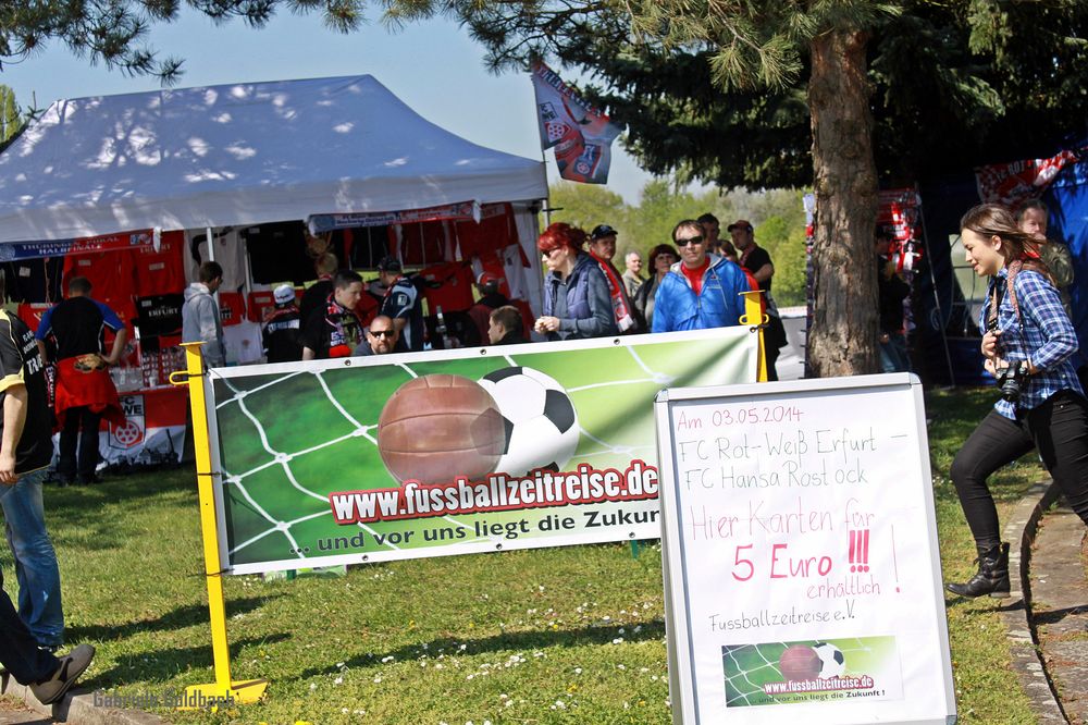 Am Ostermontag (21.04.2014) präsentierte sich die Ausstellung und der Verein Fussballzeitreise e.V. beim Halbfinale im Thüringenpokal, wo Blau-Weiss-Dachwig/Döllstedt auf den Drittligisten Rot-Weiss-Erfurt traf. Vor dem Spiel informierten die anwesenden Vereinsmitglieder über die Arbeit des Vereins Fussballzeitreise e.V. und hatten die Möglichkeit bekommen, die vom RWE überreichten Eintrittskarten für das letzte Heimspiel der Erfurter in dieser Saison zu verkaufen. Es dauerte nicht lange und alle uns noch zur Verfügung stehenden Karten waren vergriffen. Der Erlös fließt zu 100% in die Arbeit des Vereins.