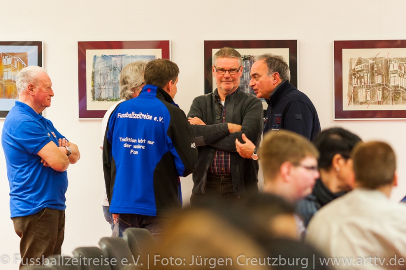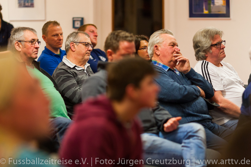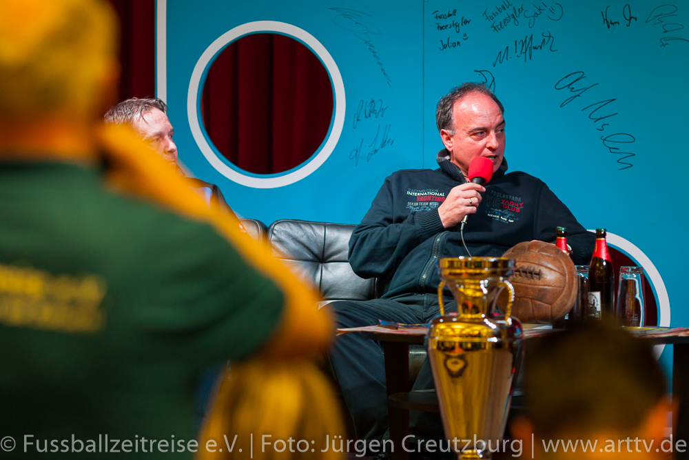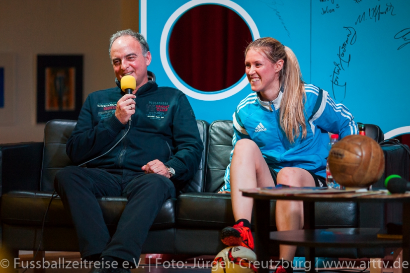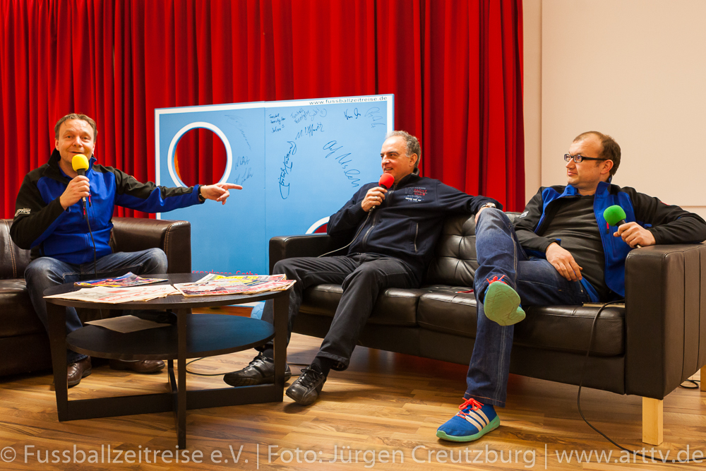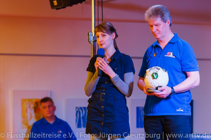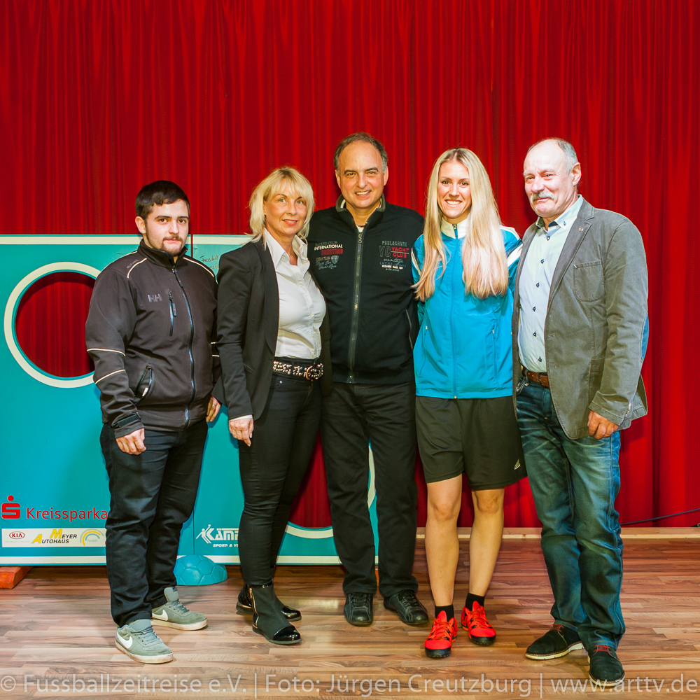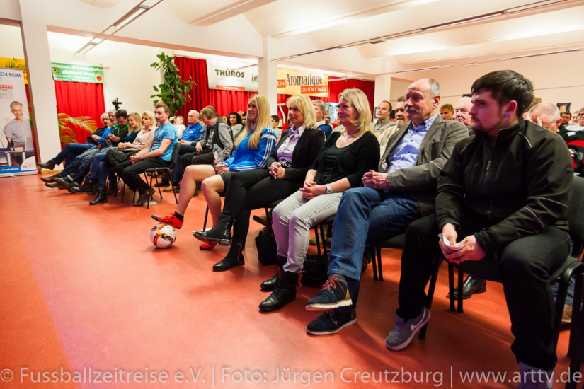 Er zeigte sich von Anfang an begeistert und beeindruckt. Gespannt und mit großen Interesse lauschte unser Stargast den Anekdoten und Geschichten von Marcel und konnte die ein oder andere hinzufügen. Auch Nina Windmüller war überwältigt von der Vielzahl und der Darstellung der Memorablien. Sie versprach noch einmal nach Tabarz zu kommen: „Diese einzigartige Ausstellung muss ich meinem Vater zeigen, er wird staunen!“ Nach dem Besuch der Ausstellung Fussballzeitreise ging es zurück in die KuKuNa, wo die vielen Besucher bereits gespannt auf unseren prominenten Talkgast warteten. Die Talkrunde wurde mit einem Videobeitrag eröffnet, indem die schönsten Tore aus der aktiven Zeit von Hansi Müller gezeigt wurden! Danach begeistere Freestyle Girl Nina Windmüller mit einer überragenden Ballsicherheit das Publikum, so dass man glauben konnte, Klebstoff wäre im Spiel! Dem war natürlich nicht so, denn intensives Training ist das Geheimnis einer solchen Leistung. Christina Dietzel (Vorsitzende) und Jens Hirschfeld (2. Vorstand) bedanken sich bei Nina für ihren 1. Auftritt am heutigen Abend. Bevor aber unser prominenter Talkgast die Bühne betrat, hatte die Fussballzeitreise noch eine wichtige Botschaft: Einen Tag vor unserer Veranstaltung ist der Bürgermeister von Tabarz, David Ortmann (Vereinsmitglied), an den Vorstand der FZR mit einer Bitte herangetreten. David Ortmann ereilte ein Hilferuf der Familie Böhm aus Schwarzhausen. Sophia Böhm, die Tochter der an Blutkrebs erkrankten Romy Böhm, bekam die Gelegenheit, vor der Talkrunde auf das schwere Schicksal ihrer Mutter aufmerksam zu machen. Da unser Vereinsmitglied, Bürgermeister David Ortmann, die Schirmherrschaft dieser Hilfsaktion übernommen hatte, war es dem Verein ein Bedürfnis, das zu unterstützen. Am 16.03.2016 tagte der Jugendausschuss des TFV in Tabarz im Hotel „Zur Post“. An diesem Abend war der Vorstand der FZR eingeladen. Peter Ott, Vorsitzender des Jugendausschusses, überreichte der Vorsitzenden der Fussballzeitreise, Christina Dietzel, 150 Euro. Bedingung der Spende, dieses Geld soll für ein soziales Projekt verwendet werden. Die Fussballzeitreise reichte diese 150 Euro an Familie Böhm weiter. Es wurde ein Spendenball an diesem Abend bereit gestellt, indem sich nach der Veranstaltung 201 Euro befanden. Geld, das dringend benötigt wird, um die Typisierung bei der DKMS zu ermöglichen. Natürlich ist es nicht leicht, nach so einer geschilderten familiären Tragödie, die Talkrunde einzuleiten. Aber unsere Moderatoren Nils und Marcel schafften es, unsere Zuschauer auf unseren prominenten Talkgast einzustimmen. Hansi Müller betrat die Bühne, ein Europameister im Jahr der Europameisterschaft! Ganz locker und ohne jede Allüren berichtete Hansi aus seiner Zeit als aktiver Fußballer. So gab es einige Anekdoten über seinen ehemaligen Mitspieler Ottmar Hitzfeld, der keinesfalls immer so brav war, wie sein Ruf heute ist und über den Unterschied im damaligen Fußball und der aktuellen Zeit. Beispielsweise konnte man sich früher viel freier bewegen und auch mal „die Sau rauslassen“ , ohne dass jeder ein Smartphone dabei hatte, um die Spieler dabei zu fotografieren. Deswegen gäbe es heute auch weniger von diesen „Typen“, denn jeder Schritt der heutigen Profis werde verfolgt und veröffentlicht. Unser Gast äußerte sich außerdem zu den Themen: Videobeweis und europäische Superliga und stellte fest: „…das alles erwünscht ist, was dem Fußball gut tut!“ Hansi Müller erläuterte aber auch, welche Parallelen es zwischen der Wirtschaftswelt und dem Sport gibt. Nach der Pause und einem weiteren hochkarätigem Auftritt von Nina begann die offene Talkrunde mit vielen interessanten Fragen aus dem Publikum. Fragen über die Chancen des VfB Stuttgart die Klasse zu halten, Hansi´s Meinung zum Fall Kruse oder auch ein Ausblick auf die Europameisterschaft wurde gegeben. Hansi Müller überreichte Marcel Wedow, Betreiber der Ausstellung FZR, ein Matchworn Trikot der Traditionsmannschaft des VfB Stuttgart mit seiner legendären Nummer 10. Dieses ist nun in der Ausstellung zu sehen! Beim abschließendem Torwandschießen hatten unsere Gäste Hansi und Nina genauso viel Spaß, wie unsere Besucher von der Diakonie und aus den Kinderheimen, die intensiv mit eingebunden wurden. Nach der Veranstaltung standen Hansi und Nina noch für ausführliche Gespräche, Fotos und Autogramme zur Verfügung. Geduldig und herzlich wurden alle Wünsche erfüllt. Nicht nur für uns Fussballzeitreisende war es ein fantastischer Abend. Hansi Müller seine bodenständige, offene und faszinierende Art begeisterte. Auch Nina Windmüller hatte mit ihrem tollen Auftritt und ihrer sympathischen Art viele Bewunderer gewonnen und wir hoffen, sie bald in Thüringen wieder zu begrüßen. Wir bedanken uns bei all unseren Sponsoren und Unterstützern, ohne sie wäre dies nicht möglich. Besonders bedanken wir uns beim Autohaus Altmann in Gotha, dem Hotel „Zur Post“ in Tabarz, Kreissparkasse Gotha, Blumenhaus und Gärtnerei Stahl in Seebach und der Rhönbrauerei Dittmar in Kaltennordheim. Vielen Dank! Wir bedanken uns auch bei den zahlreichen Gästen und Zuschauern, die uns besucht haben und diesen Abend unvergessen machen. Wir hoffen, sie hatten genauso viel Spaß wie wir! Bleiben Sie uns treu! Im Anschluss ließen wir mit Hansi und Nina den Abend im gemütlichen VIP Bereich der KuKuNa ausklingen. Die FZR hat viel Lob von unseren prominenten Gäste und auch von den zahlreichen Zuschauern für die Organisation der Veranstaltung erhalten. Ein großes Lob und ein riesen Dankeschön geht an alle mitwirkenden Fussballzeitreisenden!!! Text: Nils Schwalbe, Christina Dietzel, Marcel Wedow Fotos: Jürgen Creutzburg/Art TV, Nils Schwalbe25