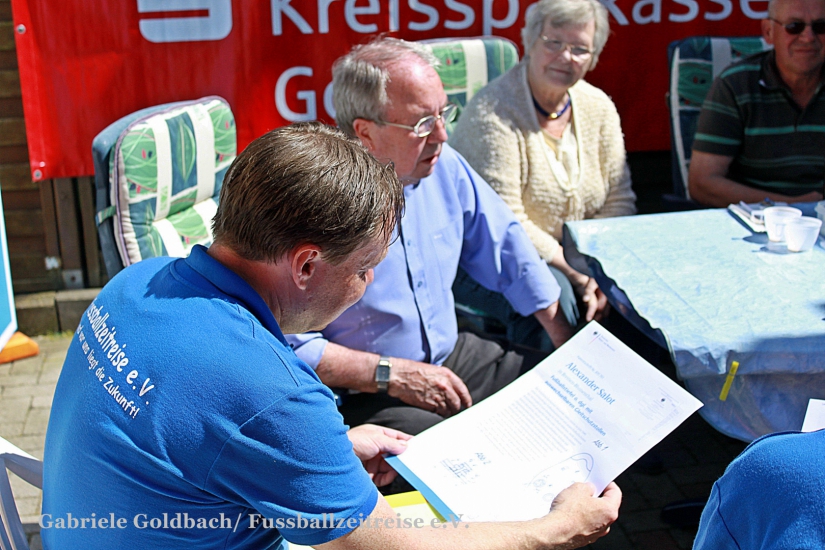 Am Männertag, den 14.05.2015 öffnete nun schon zum 3. Male die Ausstellung über den ganzen Tag ihre Türen. Diesen jährlichen Feiertag nutzen wir für einen „Tag der offenen Tür“ , um so auch einmal einen etwas anderen Männertag/Familientag möglich zu machen. Dieser Feiertag ist eine feste Größe in der Veranstaltungsreihe der Fussballzeitreise. Von 10 bis 18 Uhr kamen viele Besucher zu uns in die Lindenstraße. Das Thema Fußball ist natürlich allgegenwärtig und in gemütlicher Runde wurde bei Bier, Bratwurst, Kuchen und Kaffee auch rege erzählt, gestaunt, gescherzt und gelacht. Für Groß und Klein, Jung und Alt war etwas dabei. Im Garagenkino wurde durch Jens Hirschfeld (2. Vorstand) vieles gezeigt, bei den Führungen in der Ausstellung hatte Marcel einiges Neues zu zeigen und zu erzählen, am Schußmeßgerät konnte sich jeder beweisen.
