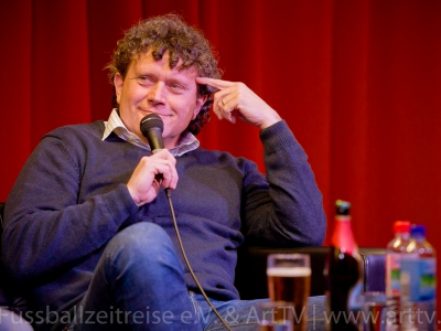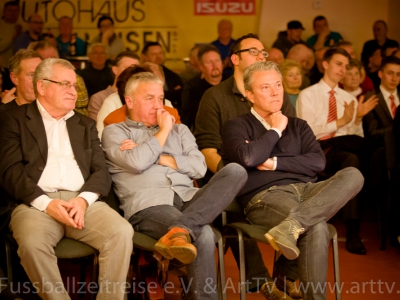 So gaben uns die beiden eloquenten Persönlichkeiten interessante Einblicke in deren Fußballer-Karriere, erzählten Anekdoten und gaben ihre Meinung zum heutigen Fußball preis. Von der Flucht Nachtweihs über die WM-Erlebnisse Marschalls bis zu ihren heutigen Aufgaben – das Publikum lauschte gebannt und hatte im Anschluss noch die Möglichkeit, selbst Fragen an die beiden ehemaligen Spieler zu stellen. Abwechslung in das Programm brachte der Freestyler Julian Hollands mit atemberaubender Ballakrobatik. In seinem Auftritt bezog er bei rhytmischer Musik das Publikum mit ein – und das zog voll mit und war absolut begeistert.