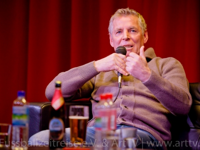 Gesprächsrunden haben sich beim Fussballzeitreise e.V. inzwischen fest etabliert und sind neben dem neu geschaffenen „Fussballzeitreise Nachwuchs-Förderpreis“, einem Ehrenamtspreis des Thüringer Fußballverbandes, wichtigstes Standbein des vor 2 Jahren gegründeten Vereins. Mit diesen Veranstaltungen leistet der Verein einen kulturellen gesellschaftlichen Beitrag und kann soziale Projekte langfristig unterstützen. Wir wollten mit den beiden ehemaligen Bundesligastars über ihre Erfahrungen und Unterschiede des DDR- und Bundesliga-Fußballs sprechen. Das Besondere: Sie hatten die fußballerischen Bedingungen in beiden Systemen kennengelernt. Ein großer Unterschied war zum Beispiel die Trainingsintensität. Norbert Nachtweih hätte in den ersten beiden Jahren bei Eintracht Frankfurt „nicht geschwitzt“, weil er noch die hohen Trainingsumfänge in Halle gewöhnt sei, erzählte er mit einem Augenzwinkern.