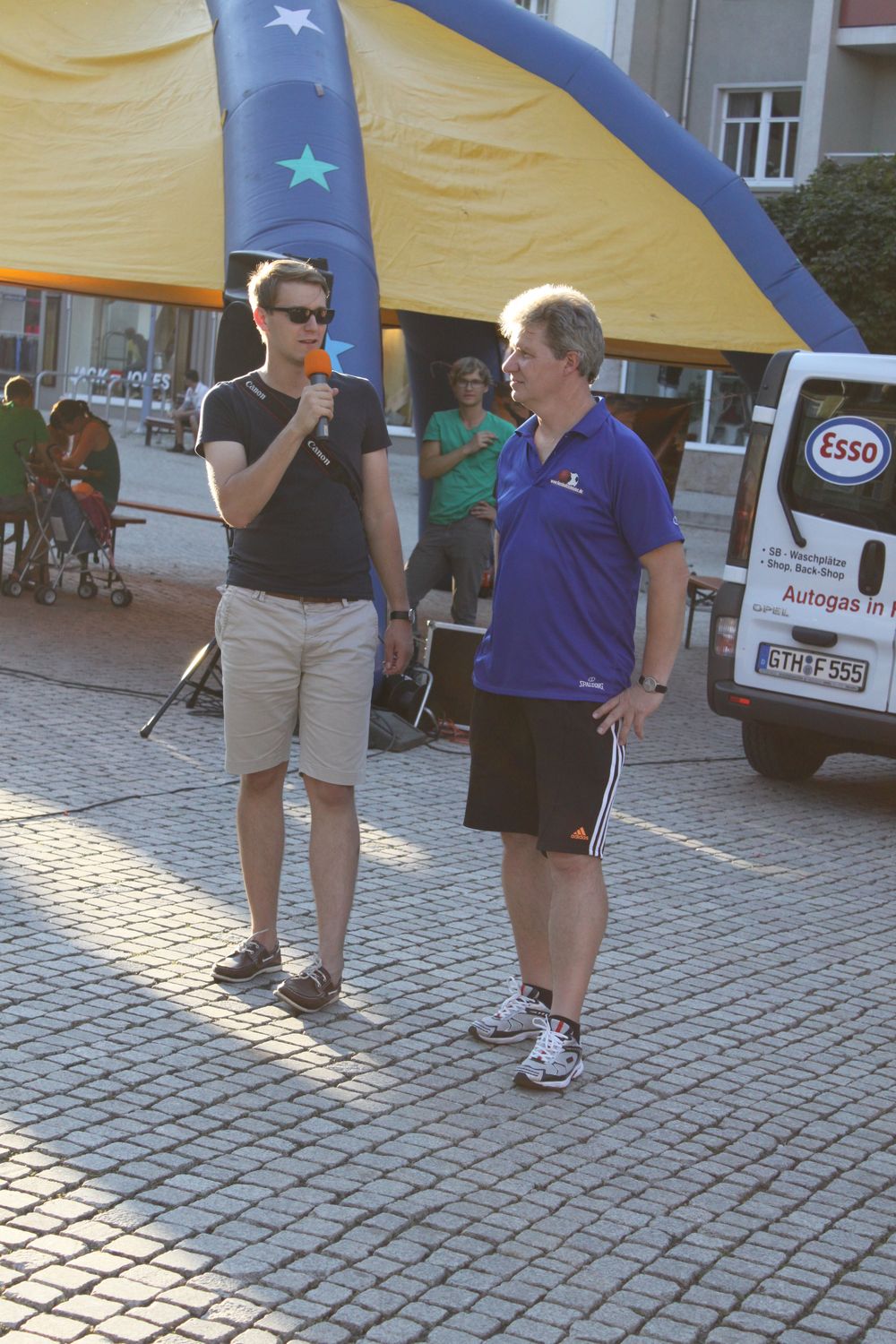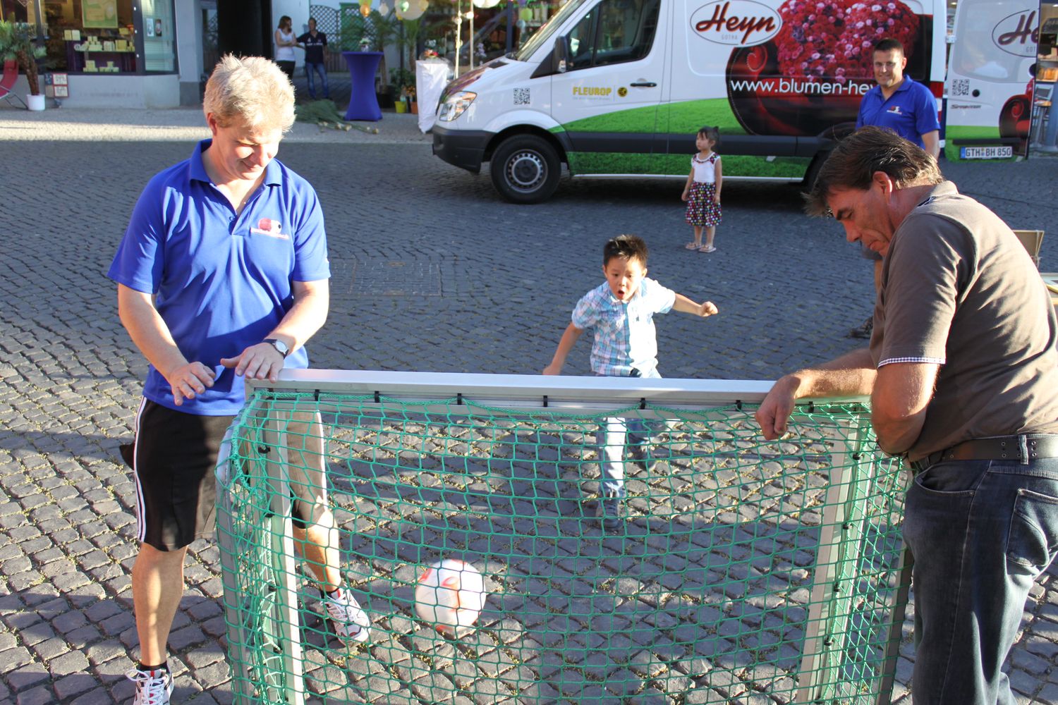 Mit 5 Leuten betreuten wir einen Stand auf dem Neumarkt der Innenstadt von Gotha. Das Wetter war einfach toll ! Unser Schussmessgerät zog viele Kinder und Erwachsene an. Es wurden viele Gespräche geführt. Einige Besucher an unserem Stand kannten die Fussballzeitreise schon aus der Presse oder waren schon in der Ausstellung in Tabarz. Der 2. Vorstand der Fussballzeitreise Jens Hirschfeld hat alles möglich gemacht, ein kleines Fußballtor zu organisieren. Andreas Goldbach hat schon einige Veranstaltungen der Fussballzeitreise unterstützt und war auch diesmal mit dabei. Andreas ist zwar kein Mitglied unseres Vereins, aber er unterstützt uns immer wieder gerne bei solchen Events. Dafür vielen Dank !