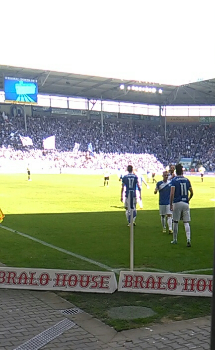 An diesem Tag kam ich mit Ralf (2. Vorstand) ins Gespräch, der als jahrzehntelanger Fan alle Höhen (1974 Sieg im Europapokal der Pokalsieger, 7 FDGB-Pokalsiege, Aufstieg in die 2.Bundesliga, Pokalviertelfinalist 2000/2001) und Tiefen (Abstieg in die 3.Liga 1991, über 10Jahre Regionalliga) des Vereins miterlebt hat. Einige Tage später bekam ich von ihm einen Link zugeschickt (Danke noch mal an dieser Stelle) in dem alle Lieder, die im Stadion gesungen werden drin standen. Diese Seite druckte ich mir aus und versuchte soweit es geht, die Lieder auswendig zu lernen.