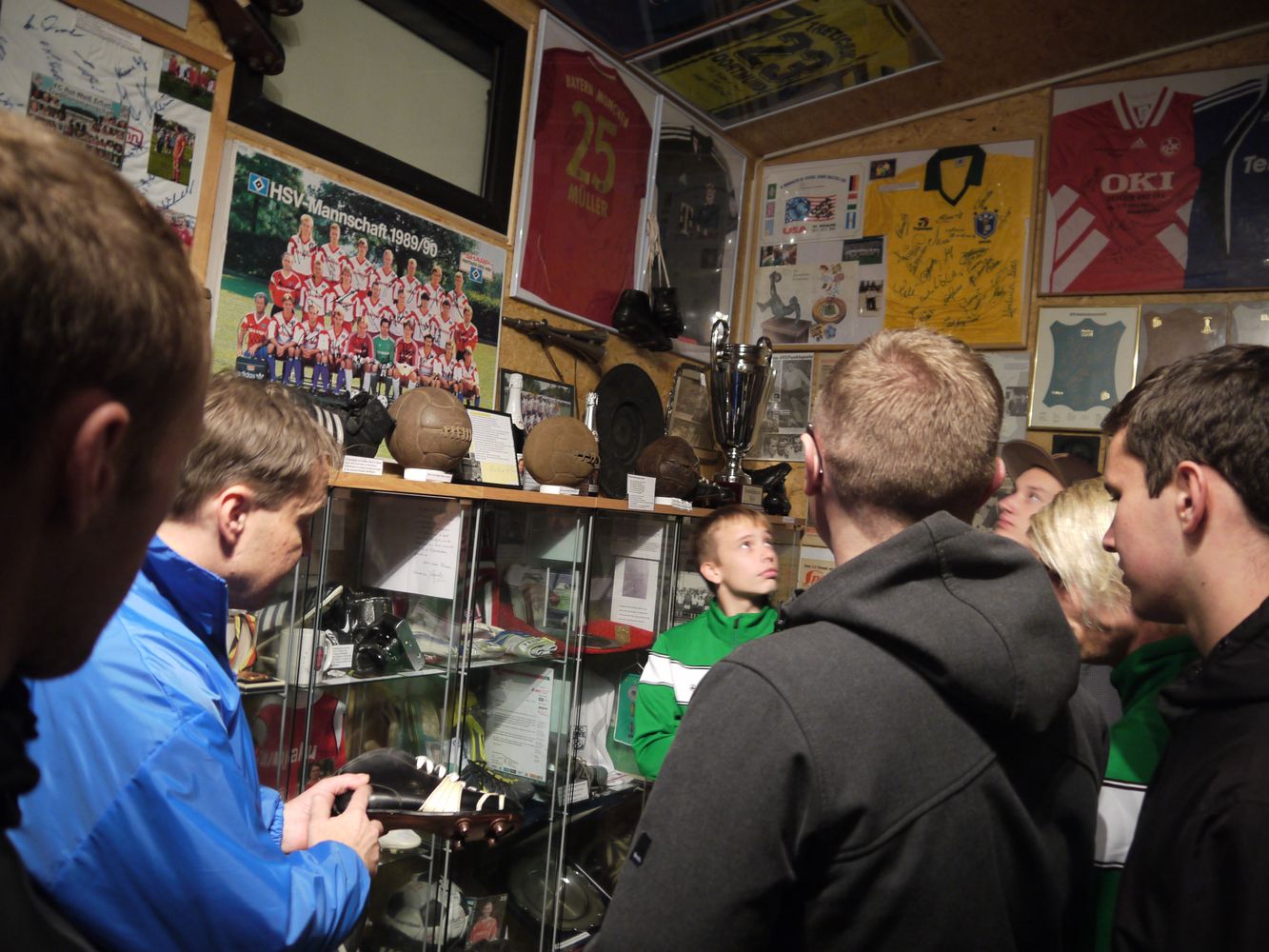 In den zwei Räumen der Ausstellung gibt es sehr viel zu sehen. Um das alles zu erfassen, anzuschauen und den Geschichten von Marcel Wedow zu lauschen, dazu bräuchte man Stunden an Zeit. Langweilig wird es keines Wegs ! Egal welches Alter zu den Besuchern zählt, es gibt für jeden etwas, die Ausstellungsstücke können angefasst werden und so ziehen hier die Spieler von Waltershausen Vergleiche, wie anders doch früher das Fußballspielen war.